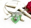 These beautiful Sea Glass Turtle Bangle Bracelets come to you in assorted colors as seen in the pictures. The manufactured Sea glass is embellished with a Tibetan Silver Sea Turtle charms and a genuine fresh water pearl. The bangle itself is adjustable to fit most wrists and is silver plated.